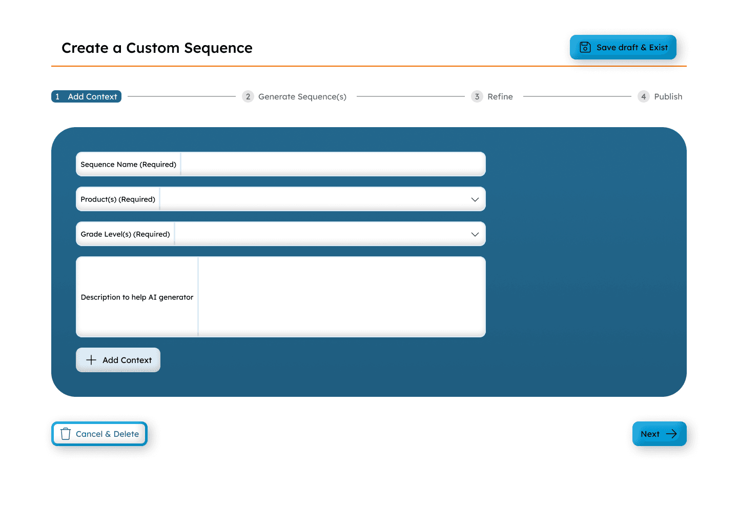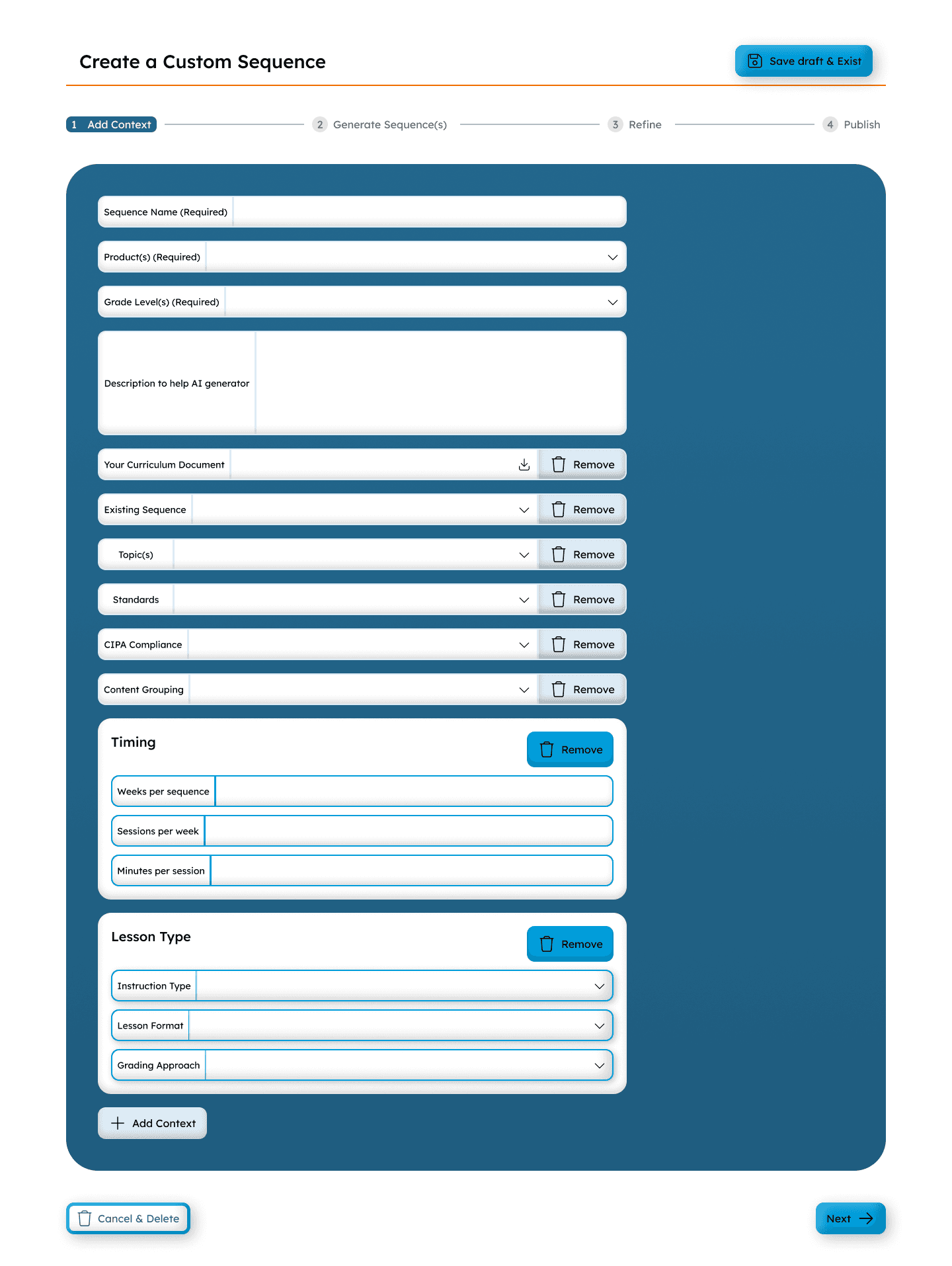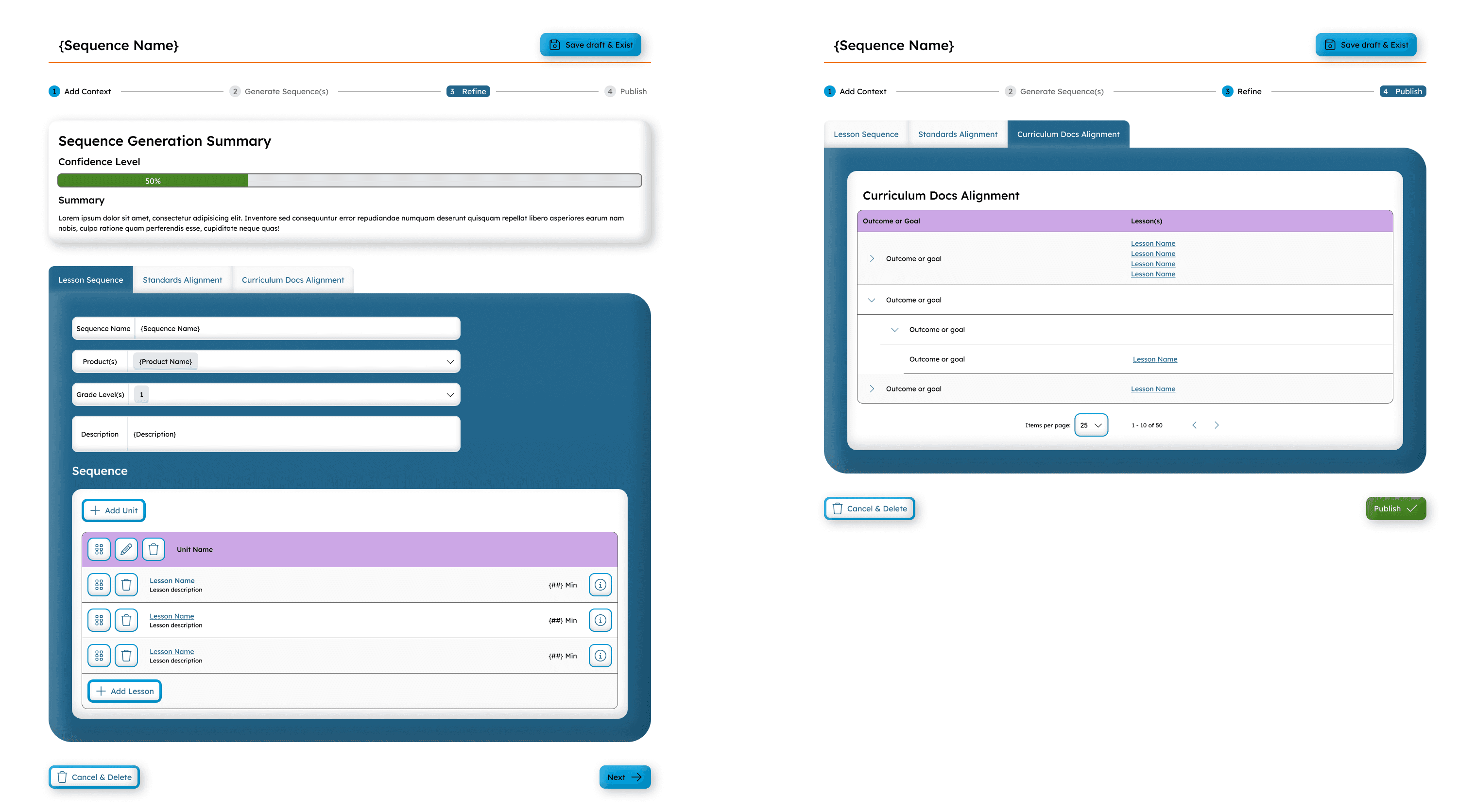 Tasked with designing the first interface to begin the transition from a legacy platform to an AI-first product, extensive analysis of the existing user research repository, new user interviews, stakeholder interviews, best-practice research, and user testing led to the development of a feature that solve the important user problem of aligning a large content library with a specific district or school's scope-and-sequence to create a custom lesson sequence in an intuitive, powerful sequence builder.